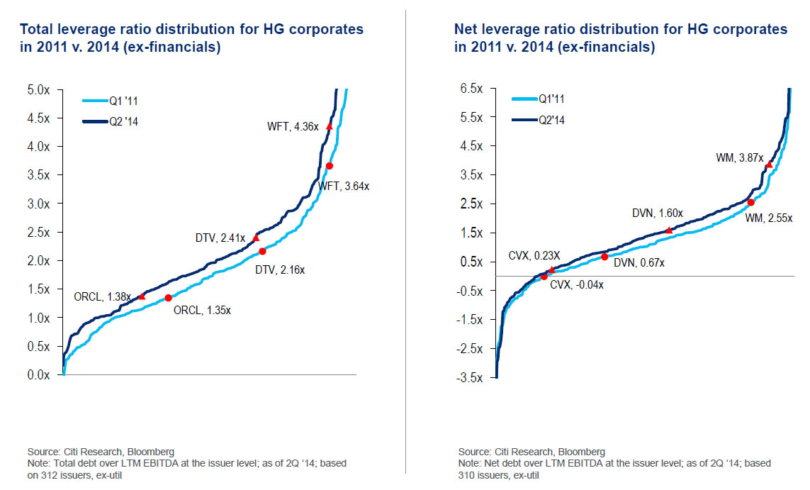 “Pretty much everybody. We calculate leverage for the IG universe today and three years ago (leverage ratio on the Y axis, names on the X axis and ordered from most to least levered). In gross and net terms there has basically been a parallel shift upward.”